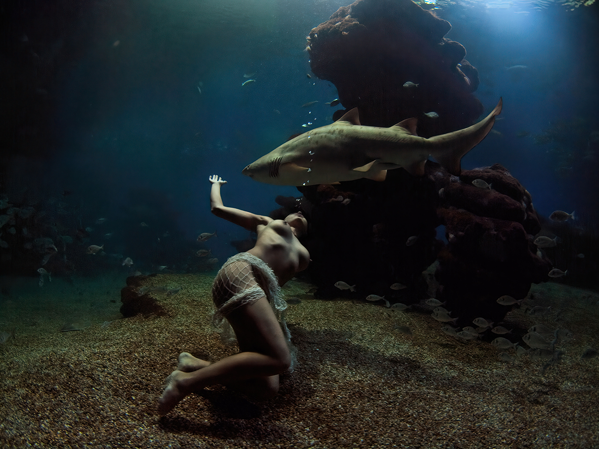 Unique recordings arose from a photoshooting at the Palma Aquarium on Mallorca as the underwater model Nadine Werner, disguised as a mermaid, plunged into Europe´s deepest shark pool. Photographs, which are presenting an almost playfully approximation between the king of the oceans and the mermaid.